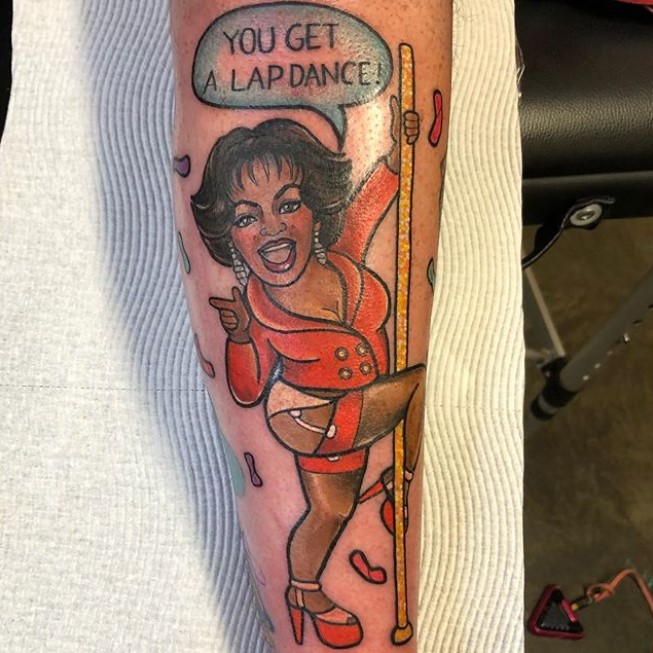 I don’t know if the person with this tattoo is a huge Oprah fan, but it is a good reminder for all of you that a tribute tattoo to someone doesn’t have to be serious or demure, or even true to life. Have fun and be playful with your tattoo choices if you so please – you might just end up with something as funny as this piece.