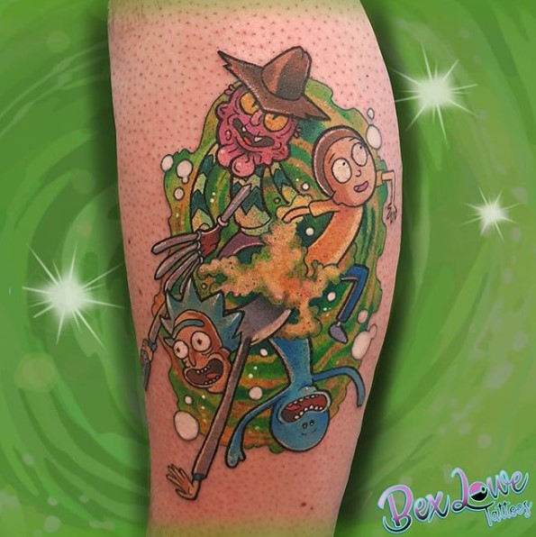 Rick, Morty, Mr Meeseeks and Scary Terry tattoo by @bexlowetattoos