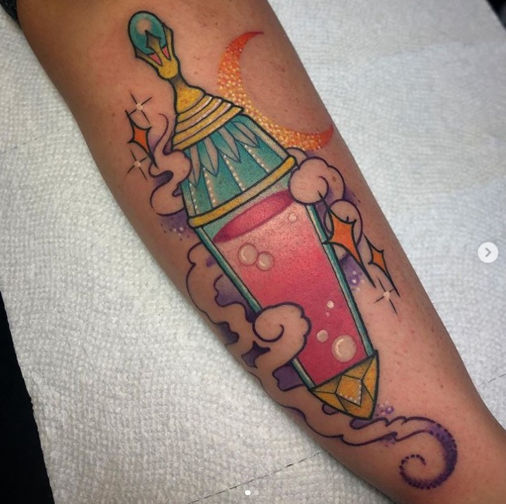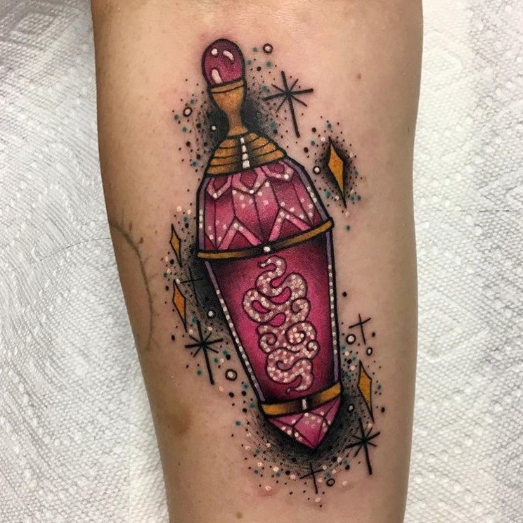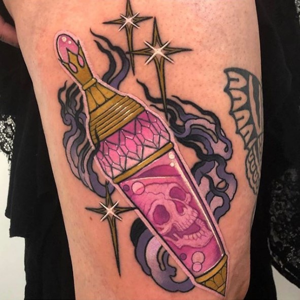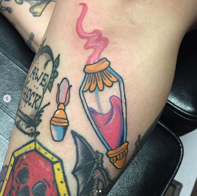 The majority of these Death Becomes Her tattoos are of the potion, with only a few exceptions; don’t let that deter you from getting the potion tattoo that you so desperately want. As you can see, each of these potion tattoos is unique and created as a one-off piece by the tattoo artists, and any reputable tattooer can create a new design just for you.