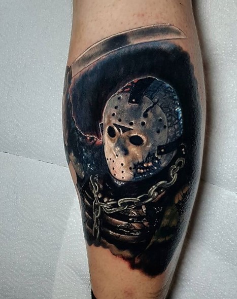 Colour realism Jason Voorhees tattoo by @joekworrall