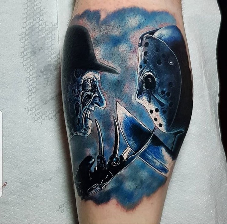 Colour realism Jason Voorhees x Freddy Krueger tattoo by @aggie_vnek