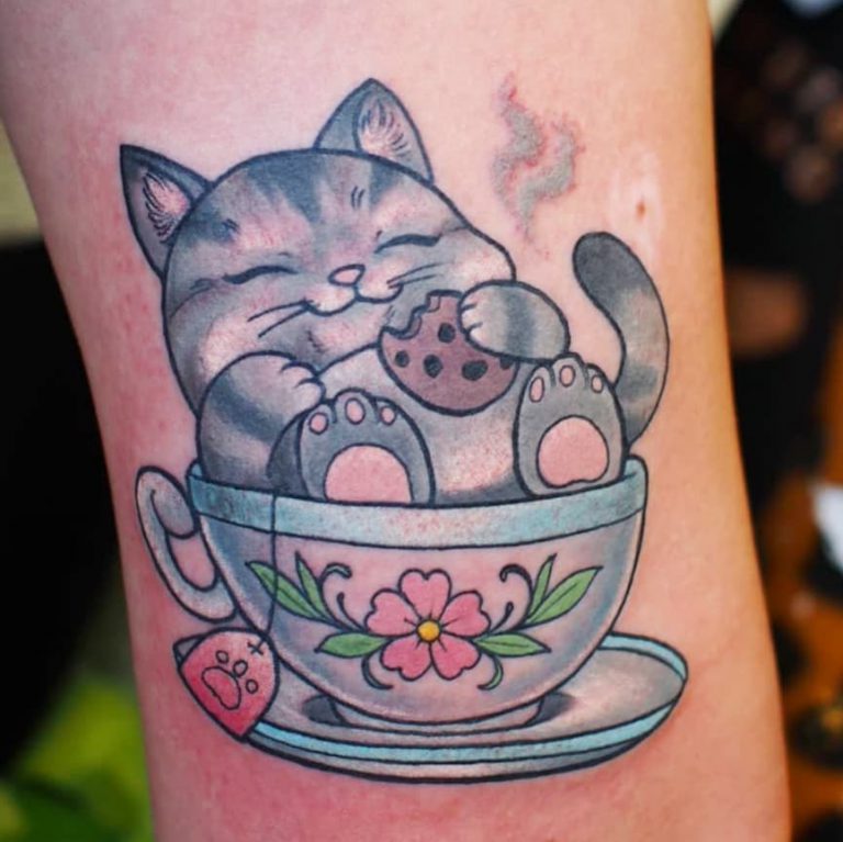 All we need – cats, cookies and tea. Tattoo by @nicole_draeger