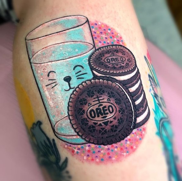 Kawaii glass of water and Oreo cookies tattoo by @karenawesom