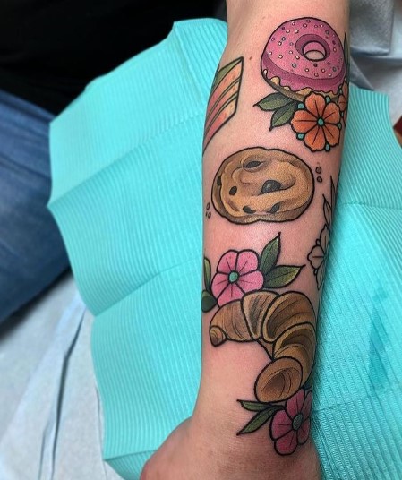 Neo trad donut, cookie and croissant tattoo by @helenadarling