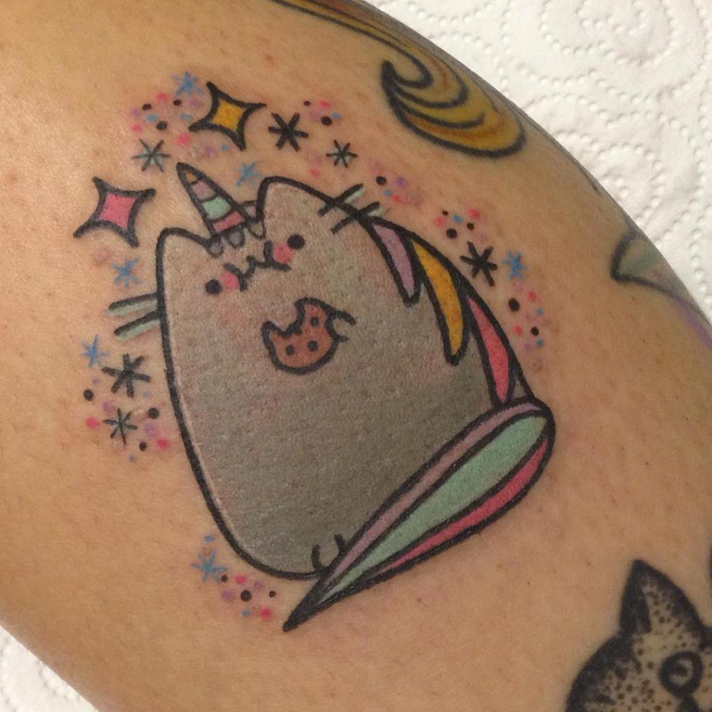 Pusheen unicorn eating a cookie. Tattoo by @roxyrydertattoo
