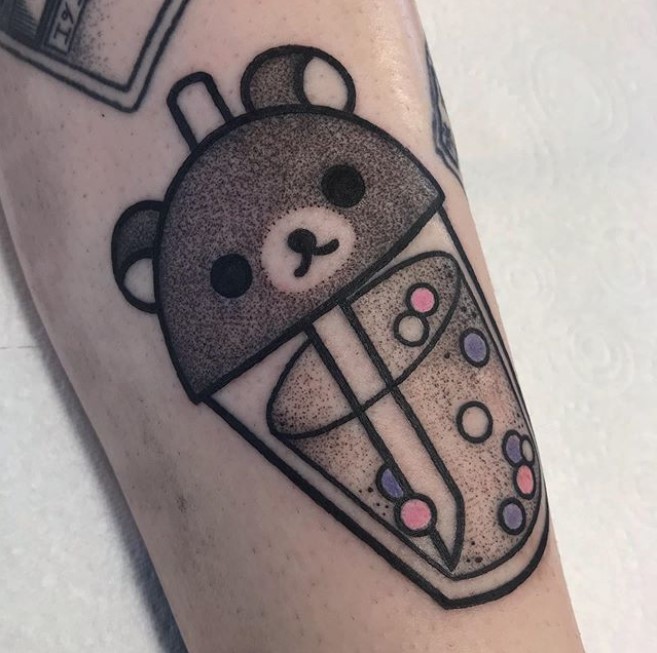 Blackwork Rilakkuma bubble tea tattoo by @raineisonfire