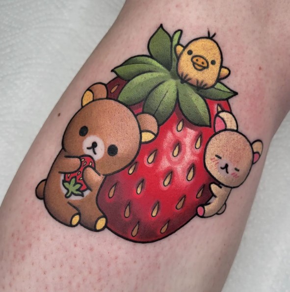 Rilakkuma, Korilakkuma, Kiiroitori and strawberry tattoo by @ali_burke_tattoo