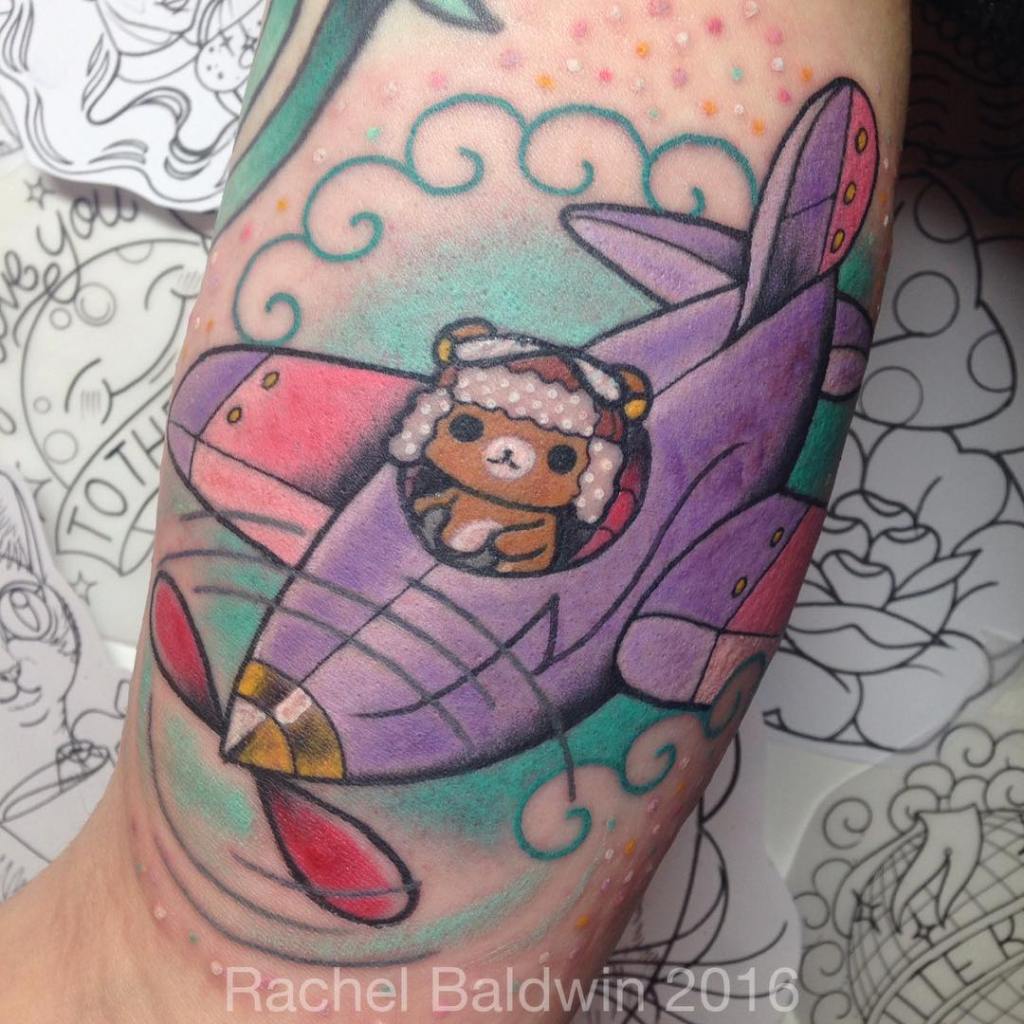 Pilot Rilakkuma flying a plane. Tattoo by @rachelbaldwintattoo
