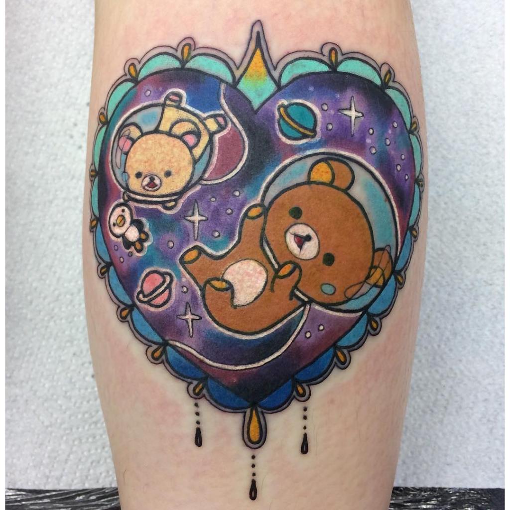 Rilakkuma and Korilakkuma in space love heart tattoo by @ashleyluka