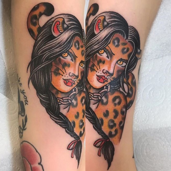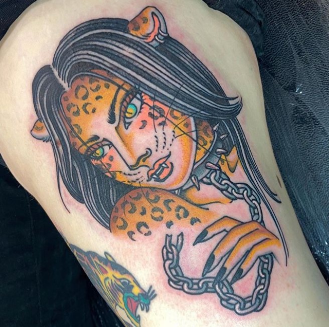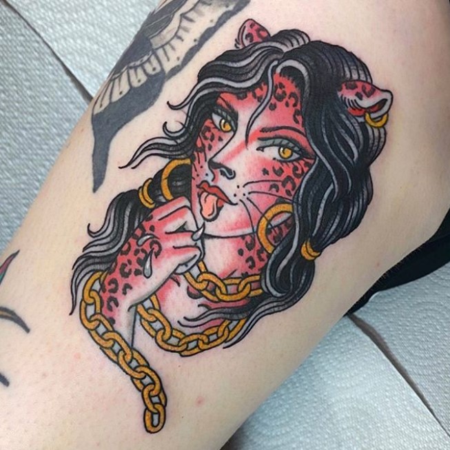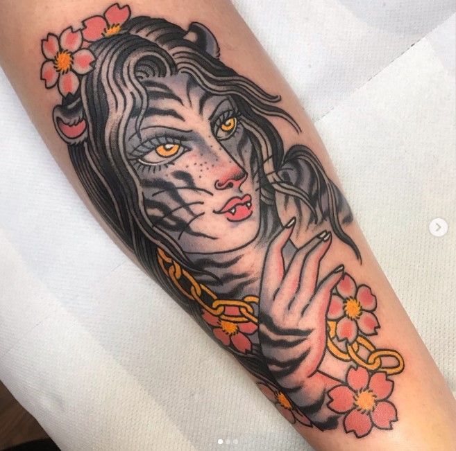 Styled with earrings, jewellery, spikes, chains or even a ball gag, there’s plenty of smaller decorative elements which you can include to add even more personality to a cat lady tattoo from Gem Carter.