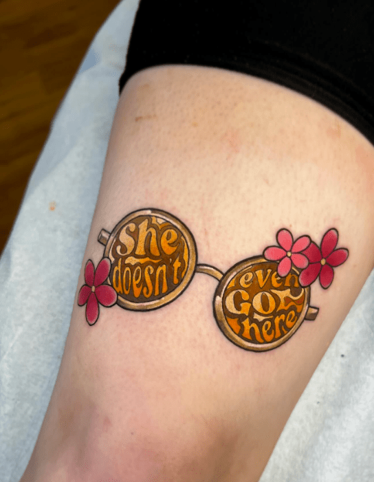 “She doesn’t even go here” Mean Girls themed sunglasses tattoo by @honey.bea.tattoos