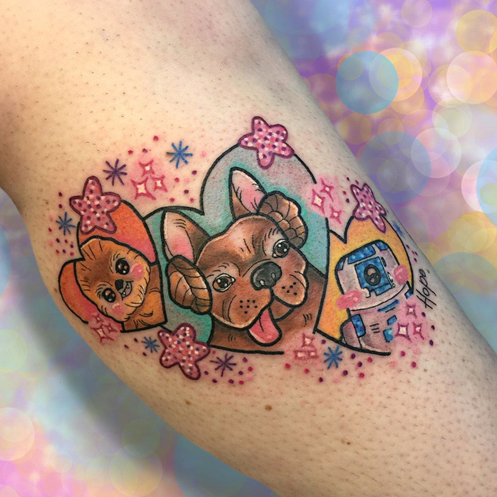 Sparkly baby Chewbacca and R2-D2, and Carrie Fisher’s dog with Leia buns in love hearts. Tattoo by @honestlydear