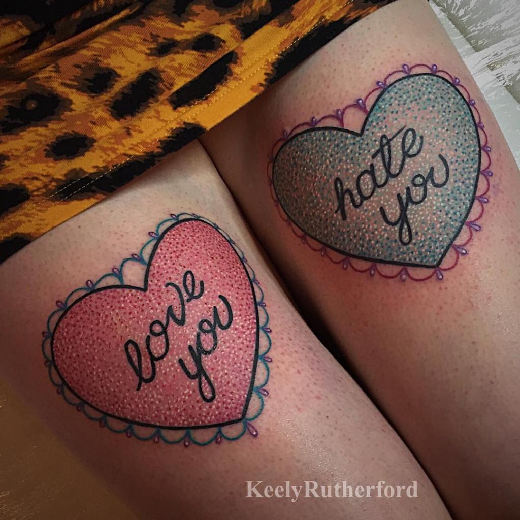 Love you and Hate you sparkly love hearts tattoos by @keelyglitters