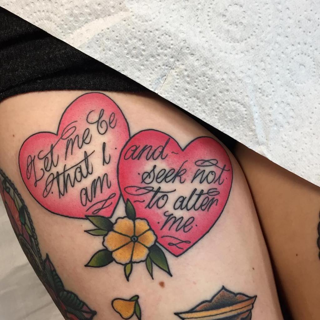 “Let me be that I am and seek not to alter me.” Shakespeare quote love hearts tattoo by @tillydee