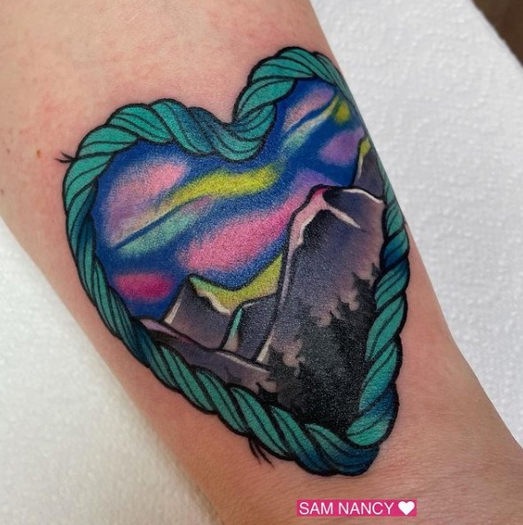 Northern Lights love heart tattoo by @sam.nancy.tattoos