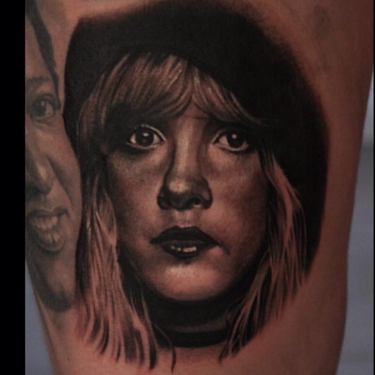 Black and grey realism Stevie Nicks portrait tattoos by @aaronpeterstattoo