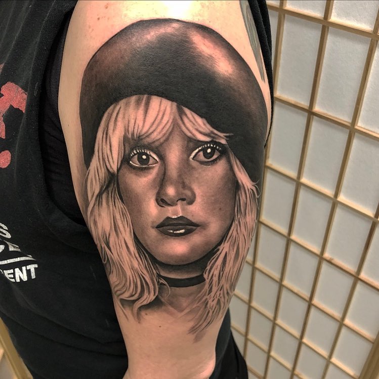 Black and grey Stevie Nicks portrait tattoo by @garymossman