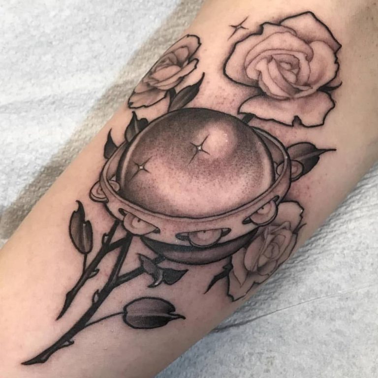 Black and grey stylised roses, crystal ball and tambourine Stevie Nicks inspired tattoo by @kristenfanchertattoos