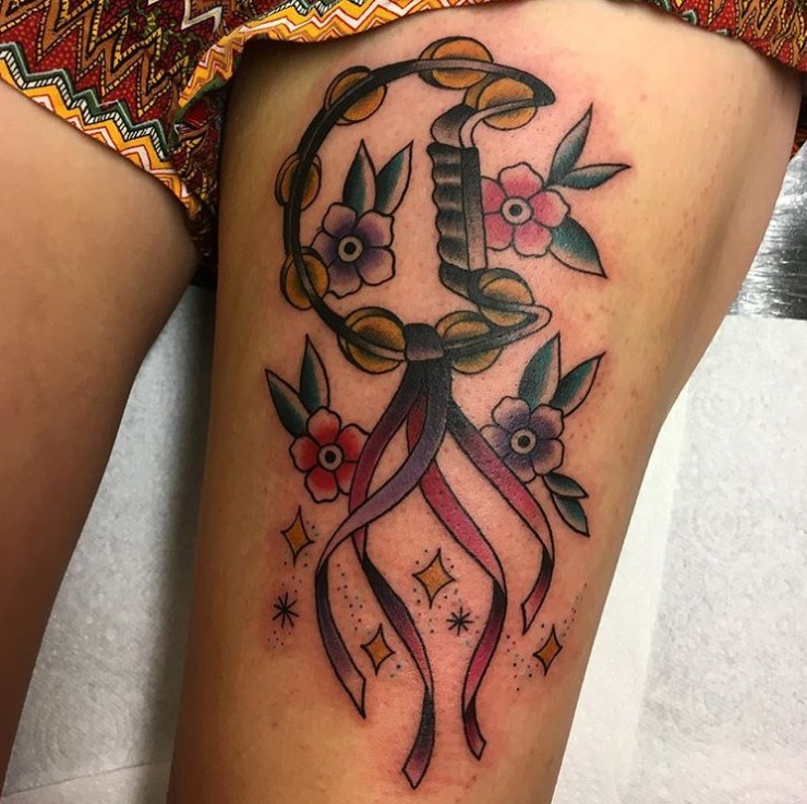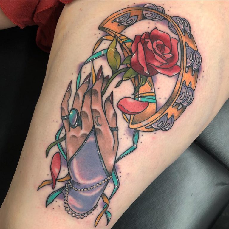 Neo trad Stevie Nicks themed hand and tambourine tattoo by @lucybluetattoo