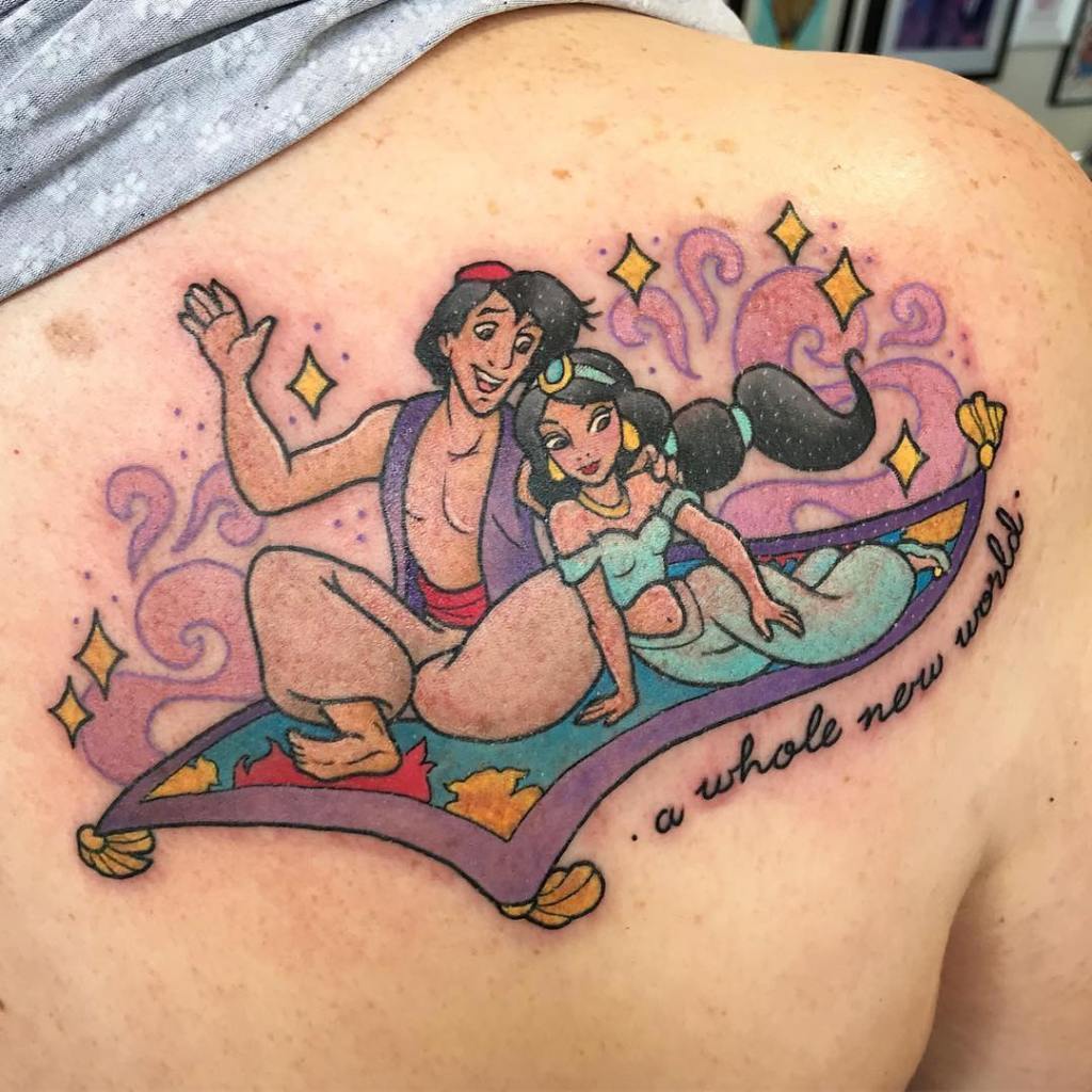 “A whole new world.” Aladdin and Princess Jasmine on a magic carpet ride tattoo by @katweir