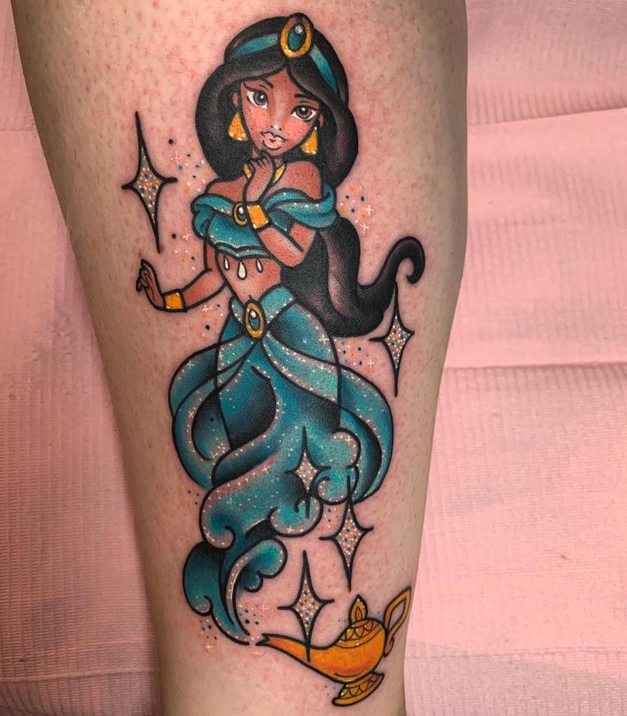 Sparkly Princess Jasmine and Genie lamp tattoo by @kellymcmurraytattooer