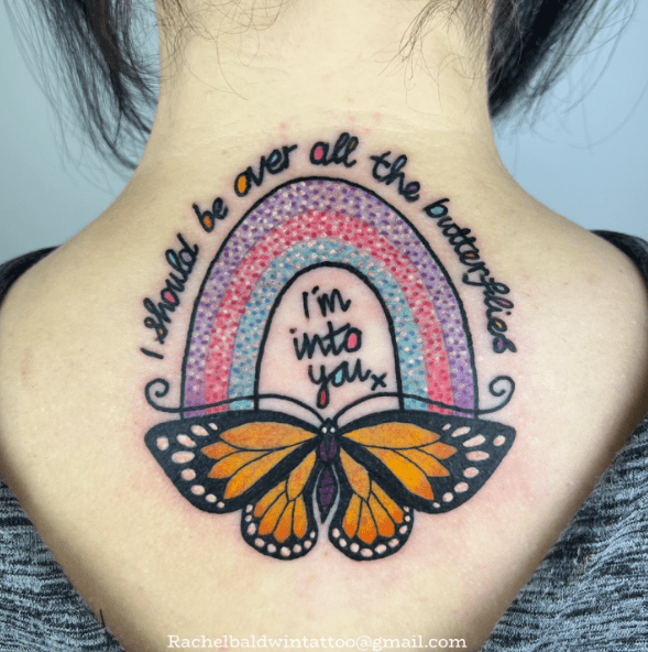 “I should be over all the butterflies, I’m into you.” Sparkly rainbow and butterfly Paramore tattoo by @rachelbaldwintattoo