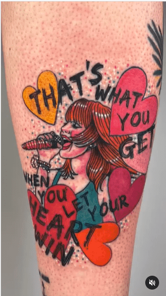 “That’s what you get when you let your heart win.” Hayley Williams surrounded by love hearts tattoo by @rachelbaldwintattoo