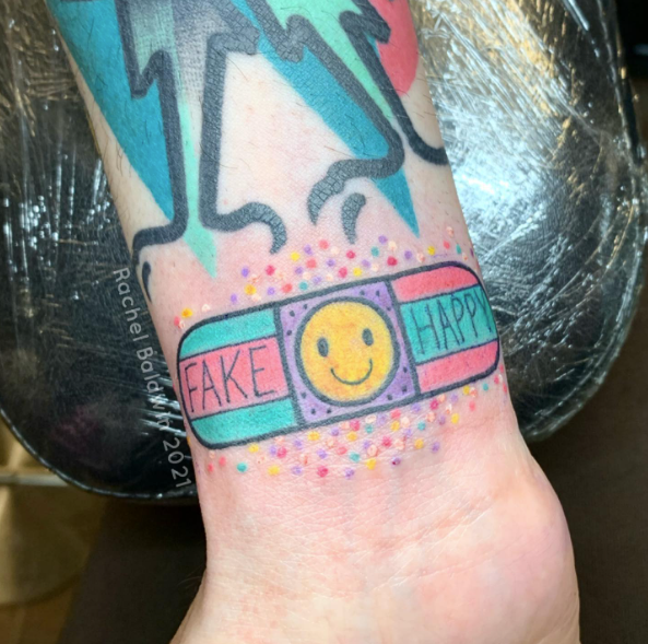 Fake Happy band aid tattoo by @rachelbaldwintattoo