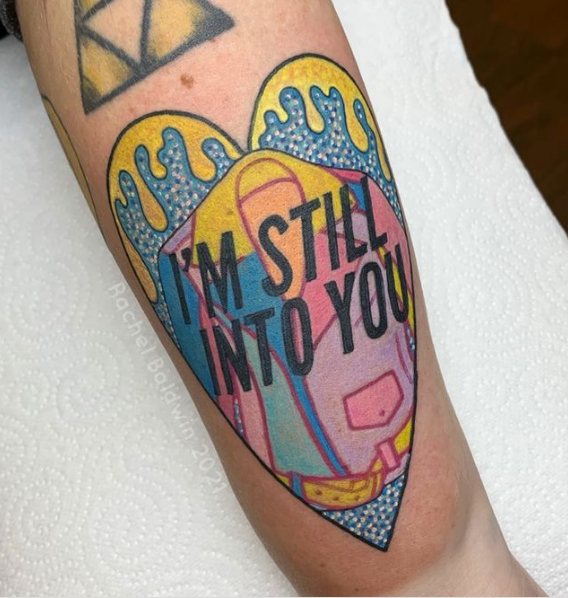Graphic “I’m Still Into You” love heart tattoo by @rachelbaldwintattoo