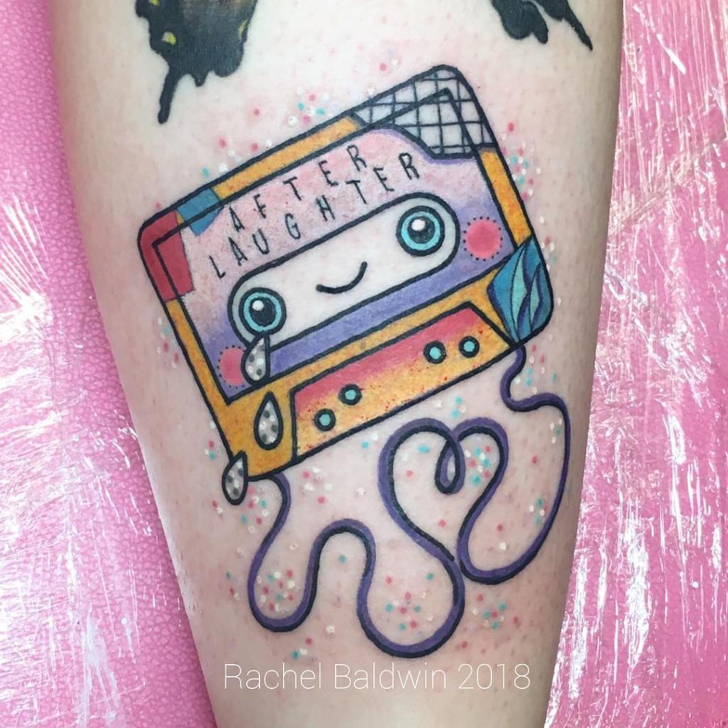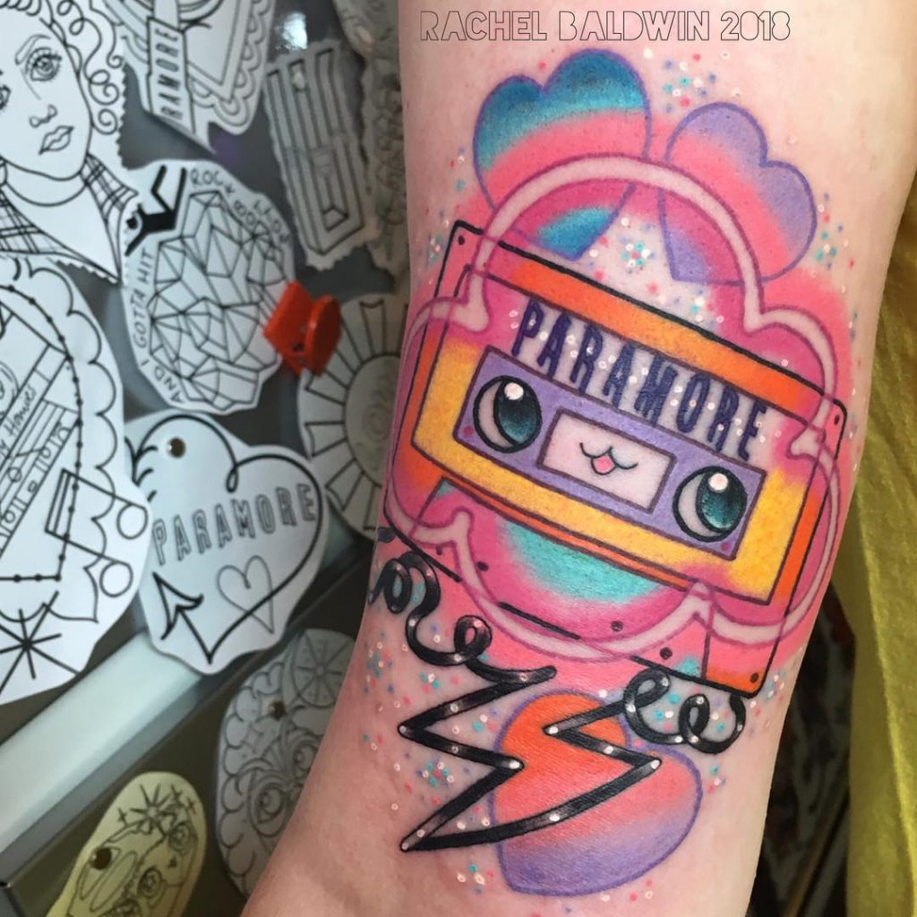 Colourful kawaii Paramore cassette tape tattoo by @rachelbaldwintattoo