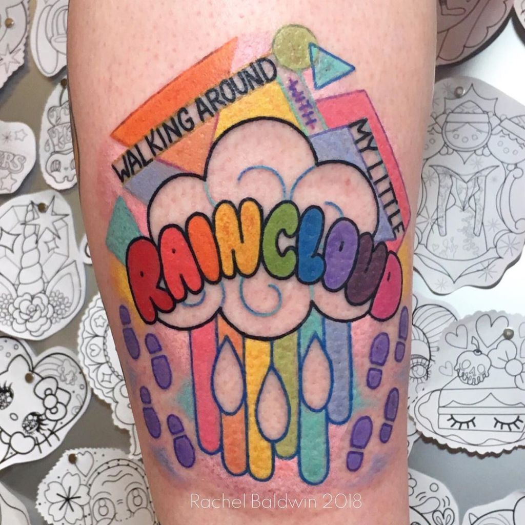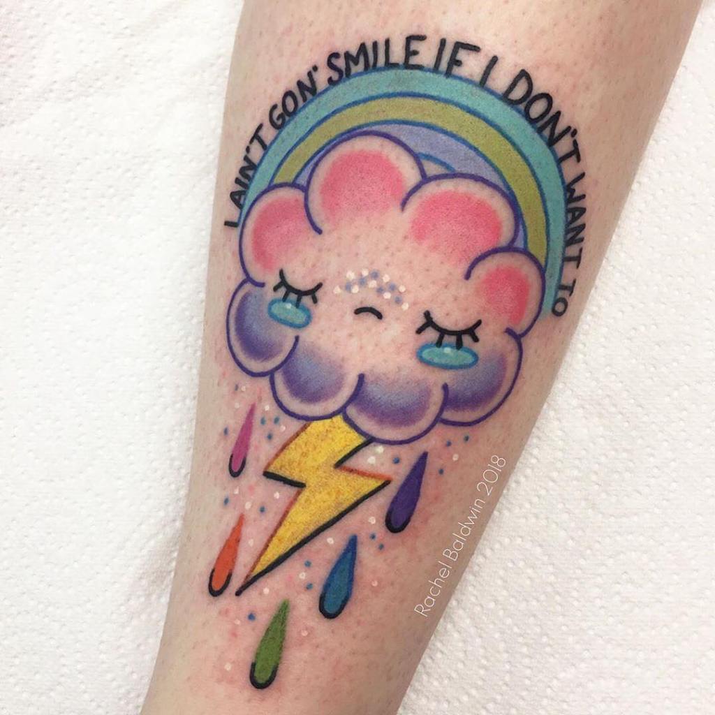 “I ain’t gon’ smile if I don’t want to.” Sad cloud and rainbow tattoo by @rachelbaldwintattoo