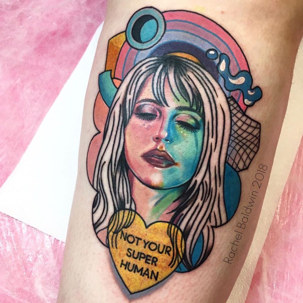 Not your super human. Graphic Hayley Williams tattoo by @rachelbaldwintattoo