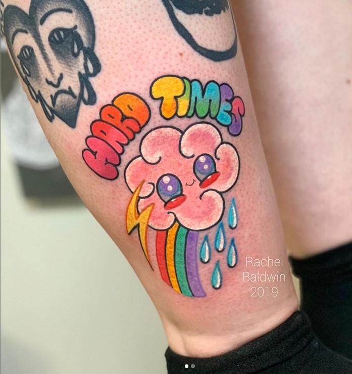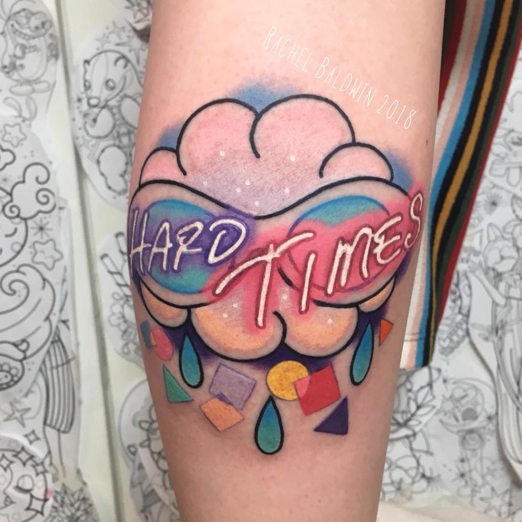 Hard Times – Kawaii cloud and rainbow tattoo by @rachelbaldwintattoo