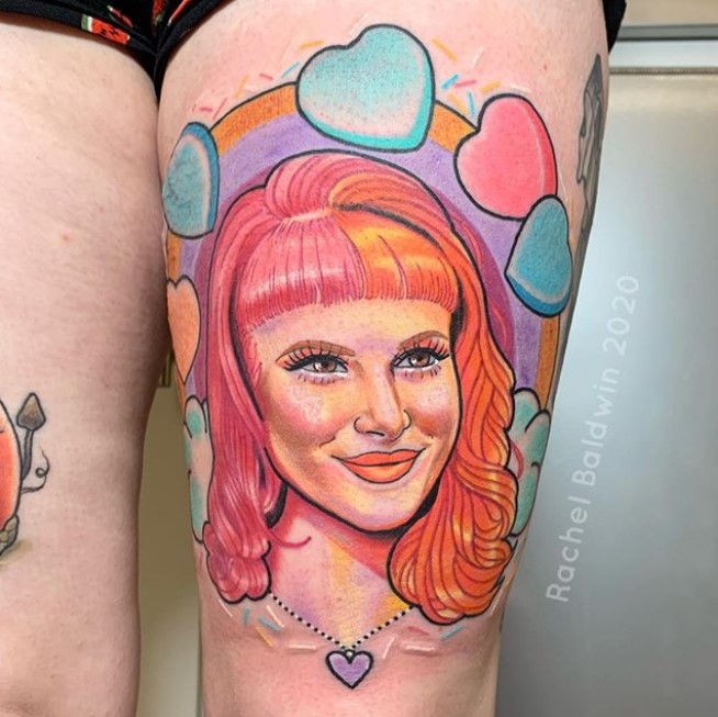 Pastel Hayley Williams and candy hearts tattoo by @rachelbaldwintattoo