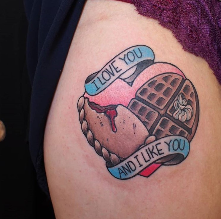 Leslie and Ben waffles and calzone (Parks and Recreation) tattoo by @nicole_draeger