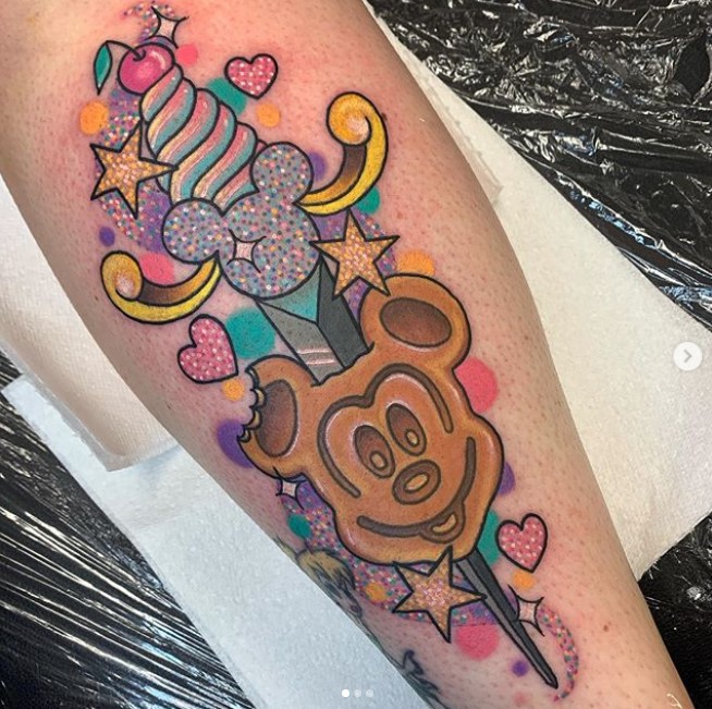 Mickey Mouse waffle on a kawaii dagger. Tattoo by @littlerachtattoo