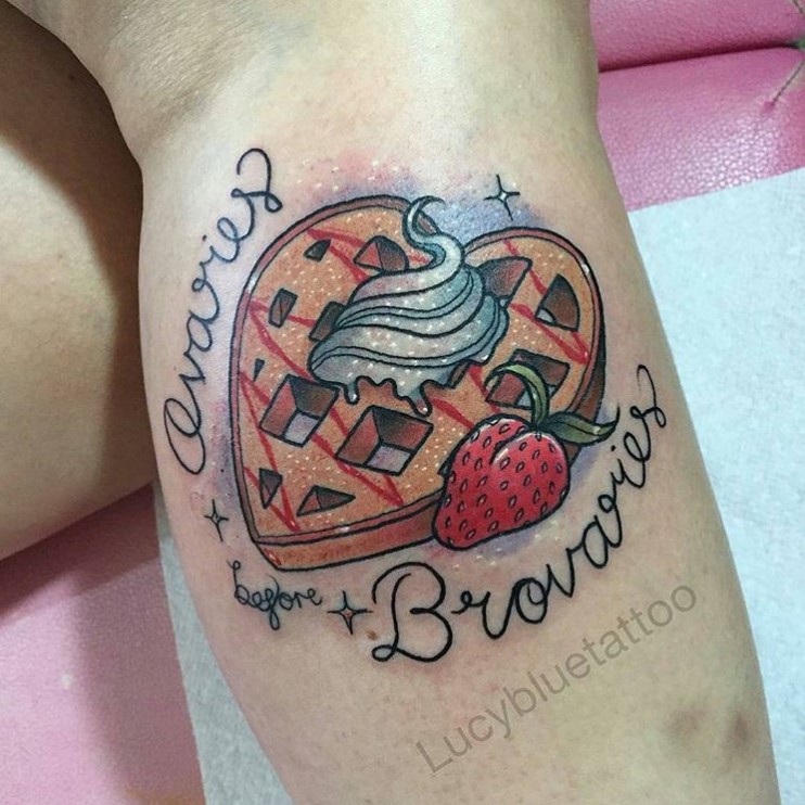 “Ovaries before brovaries.” Parks and Recreation inspired waffle tattoo by @lucybluetattoo