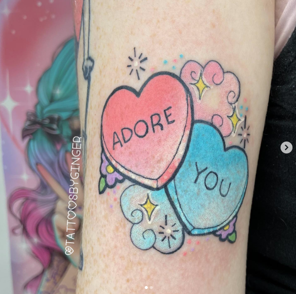 “Adore You” candy hearts tattoo by @tattoosbyginger