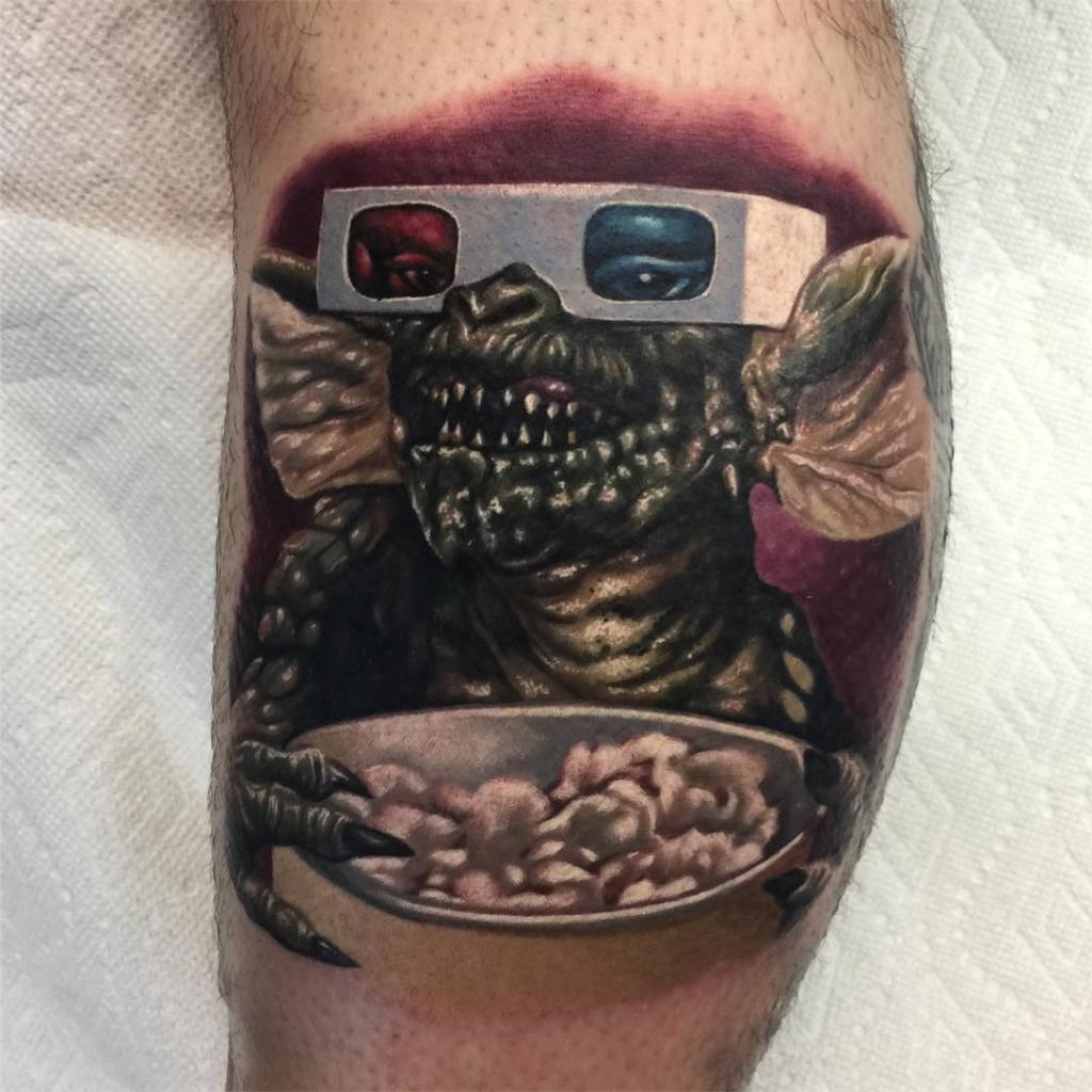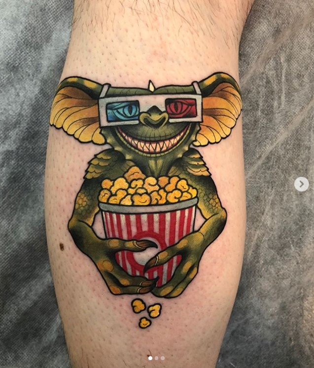 3D glasses clad gremlin enjoying some popcorn. Tattoo by @audie_tattoos