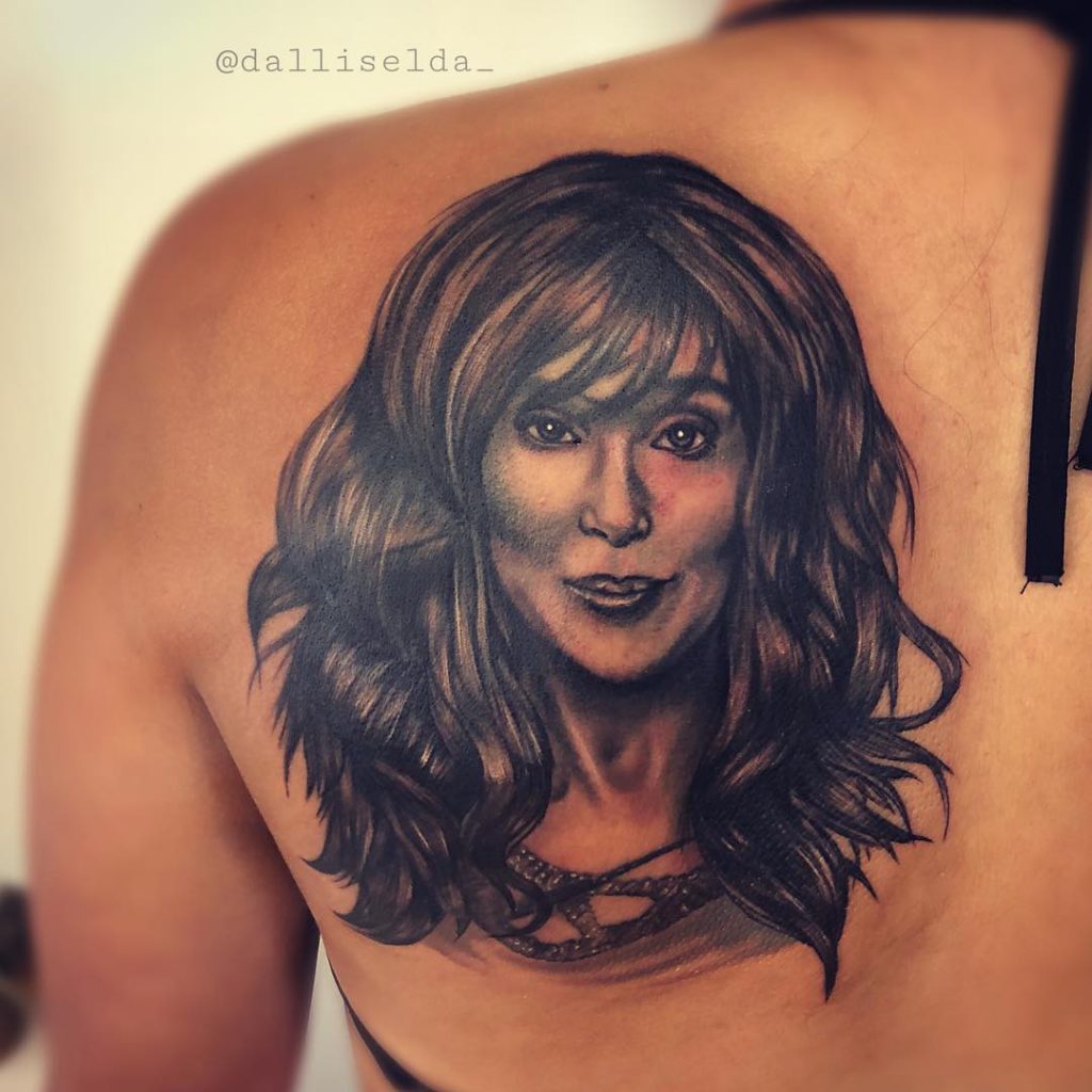 Colour realism Cher portrait tattoo by an artist at @darkhorse_collective