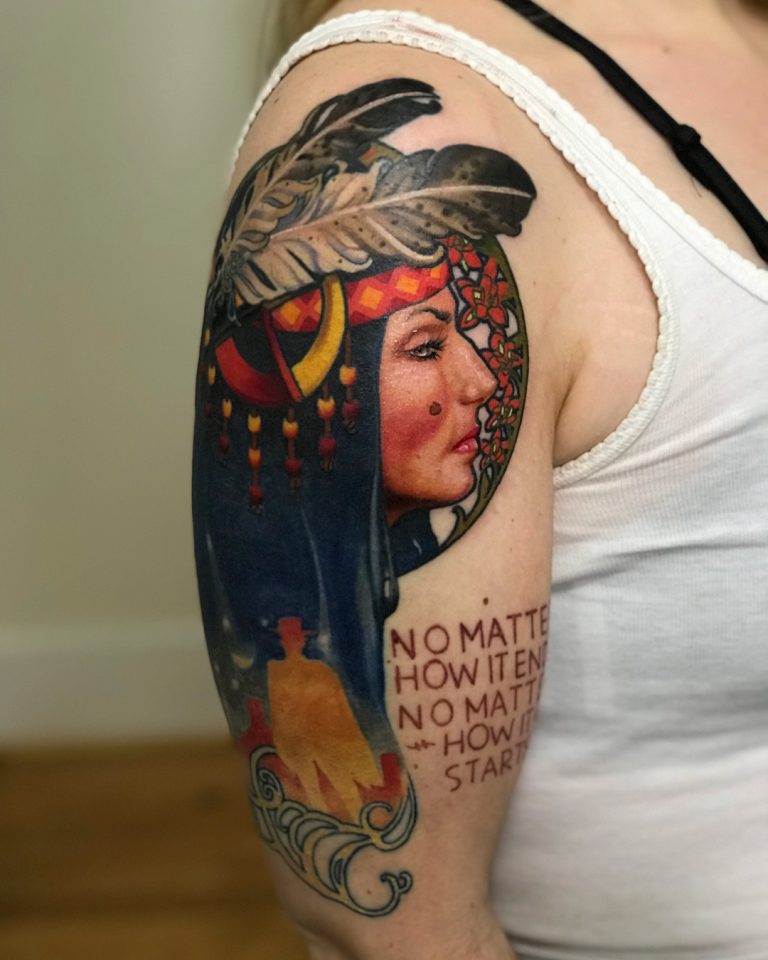 Traditional style the virgin Cher tattoo by @lonerosetattoo