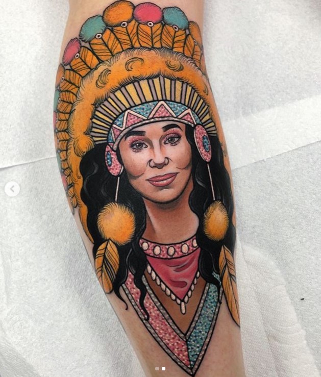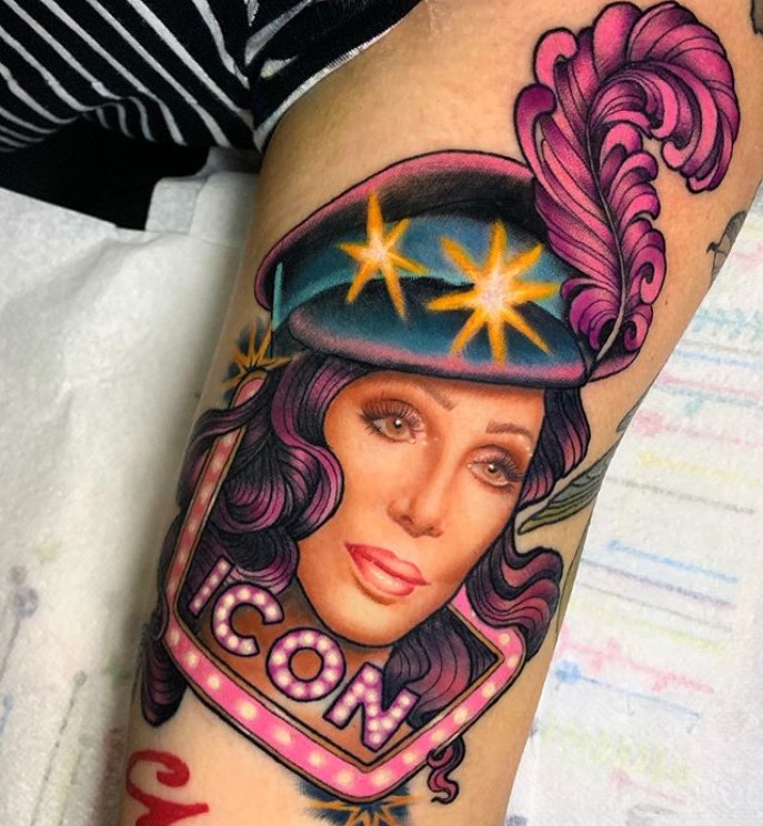 Known for her extravagant and barely there outfits, a Cher tattoo can be just as over the top decorative, or a more subdued realism portrait; it all depends what Cher means to you and which era you wish to portray in ink.