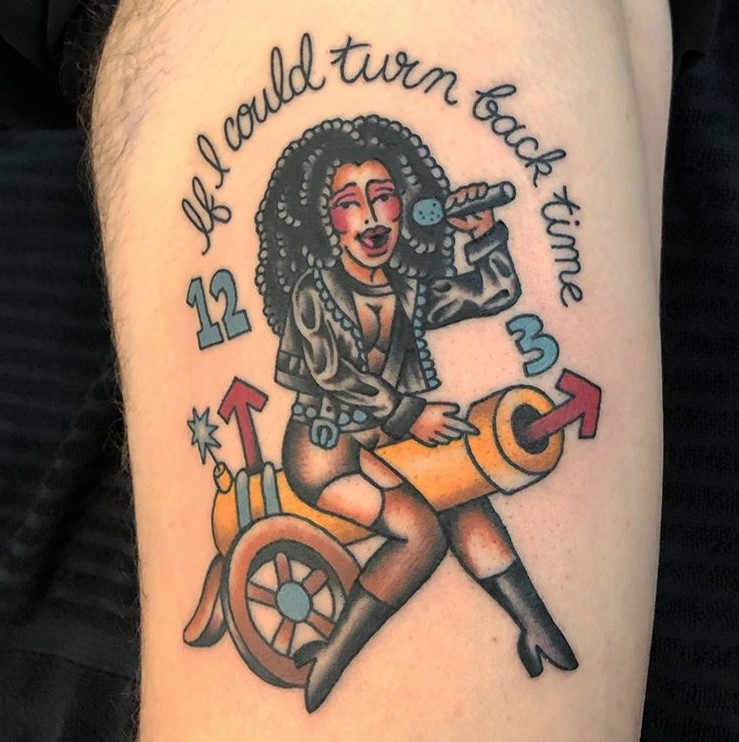 “If I could turn back time.” Traditional Cher tattoo by @los_sanchez
