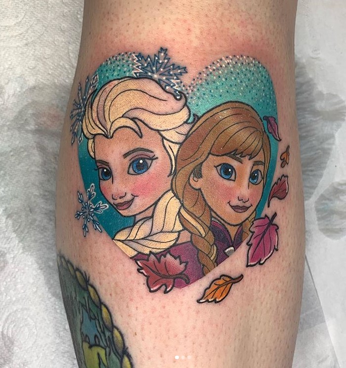 Elsa and Anna love heart tattoo by @alexrowntreetattoo