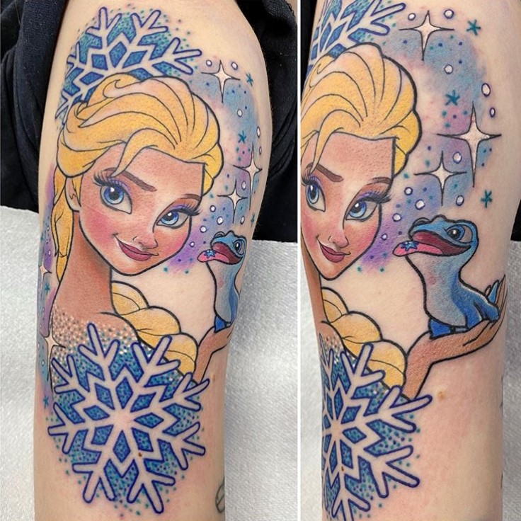 Elsa and Olaf tattoo by @damienwickhamtattoo