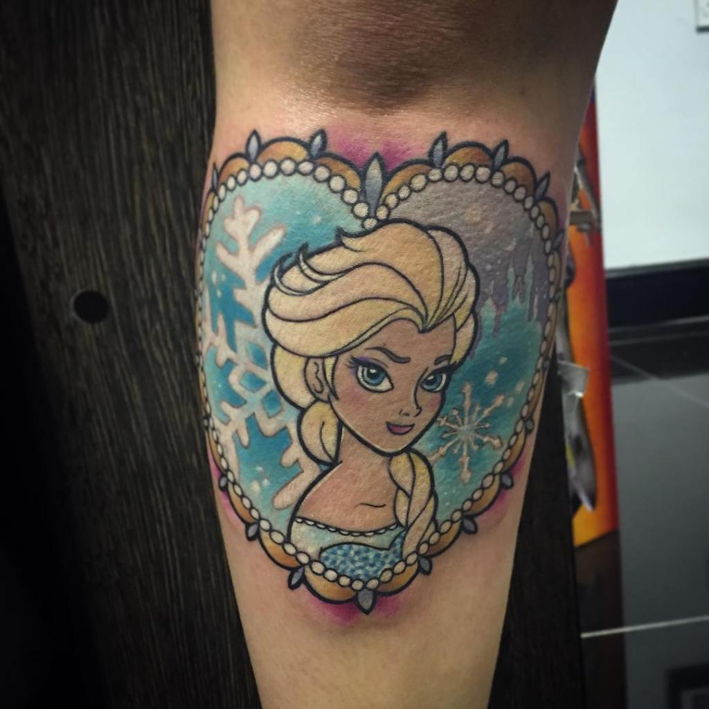 Neo trad framed Elsa tattoo by @paintedladytattoo
