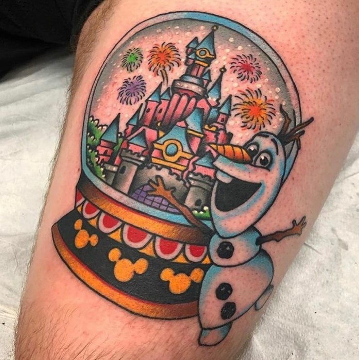 Traditional Olaf and snow globe tattoo by @mikey_ratt
