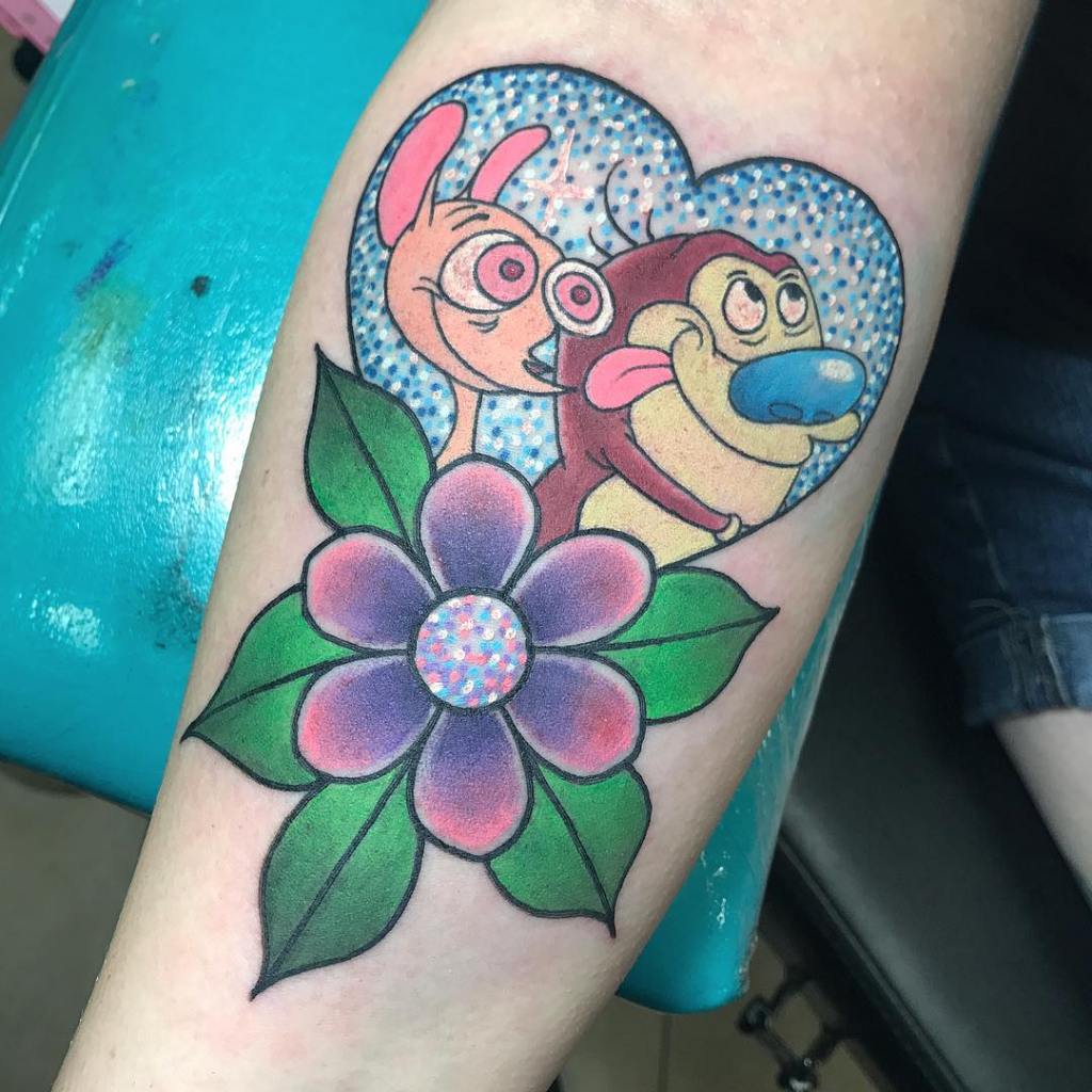 Ren and Stimpy sparkly love heart and flower tattoo by @chelseytattoos