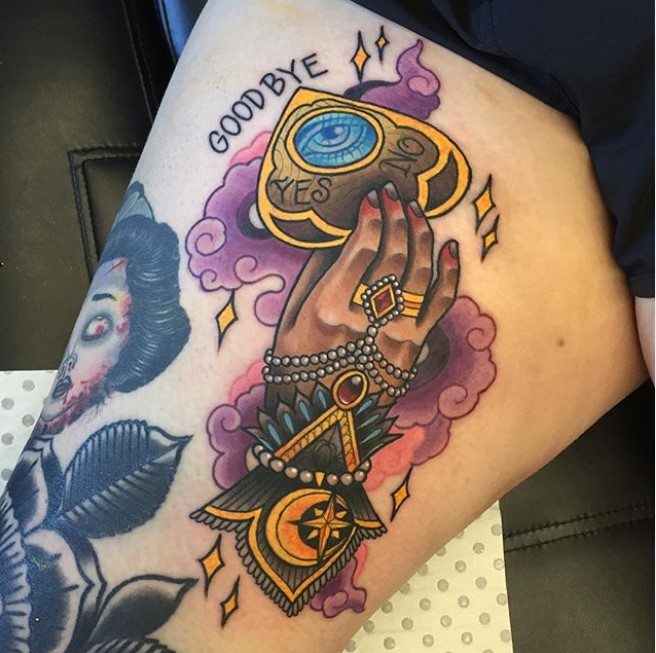 Decorative hand and planchette tattoo by @ebony_mellowship