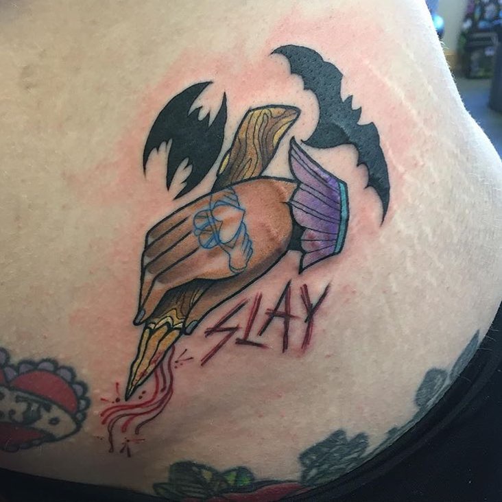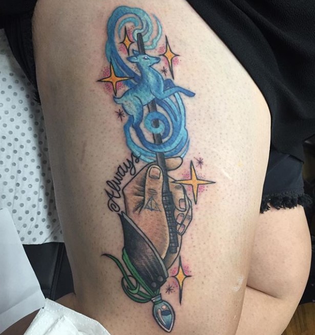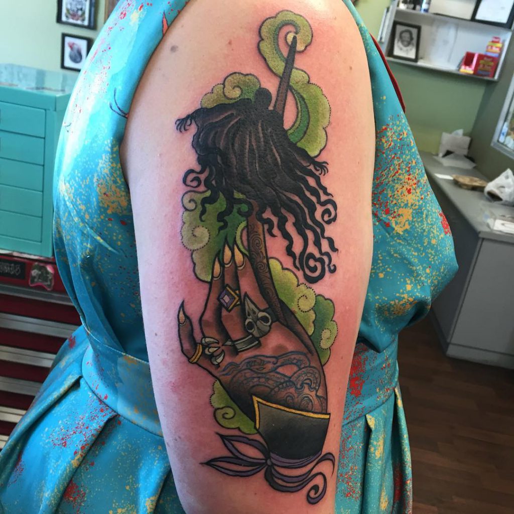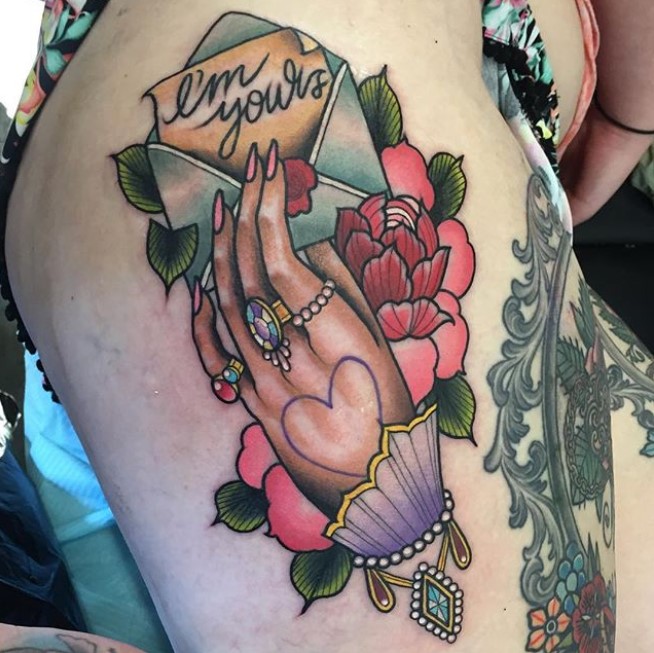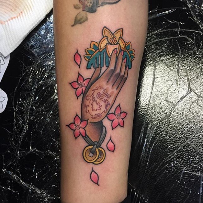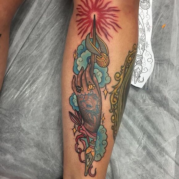 Ebony is known for her flawless neo trad tattoos and the pieces I’ve selected to show you are no exception. It is impressive how something as simple as a hand can be completely transformed by the client’s desired theme, with their concepts ranging from Harry Potter, animals, hobbies, flowers, and television shows.